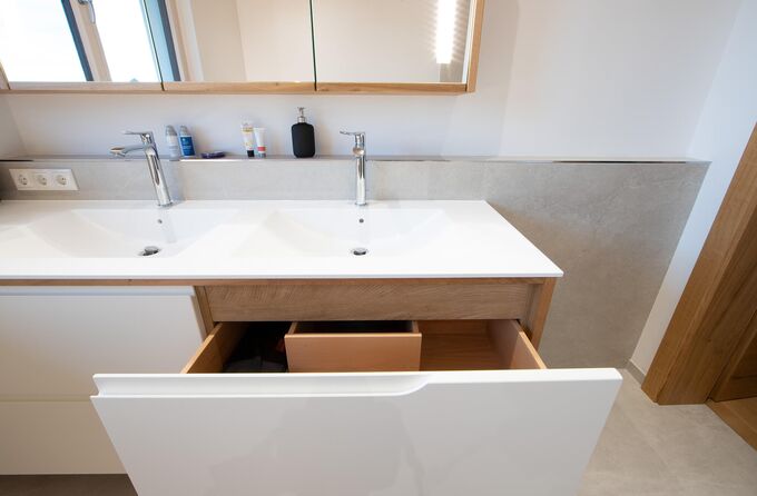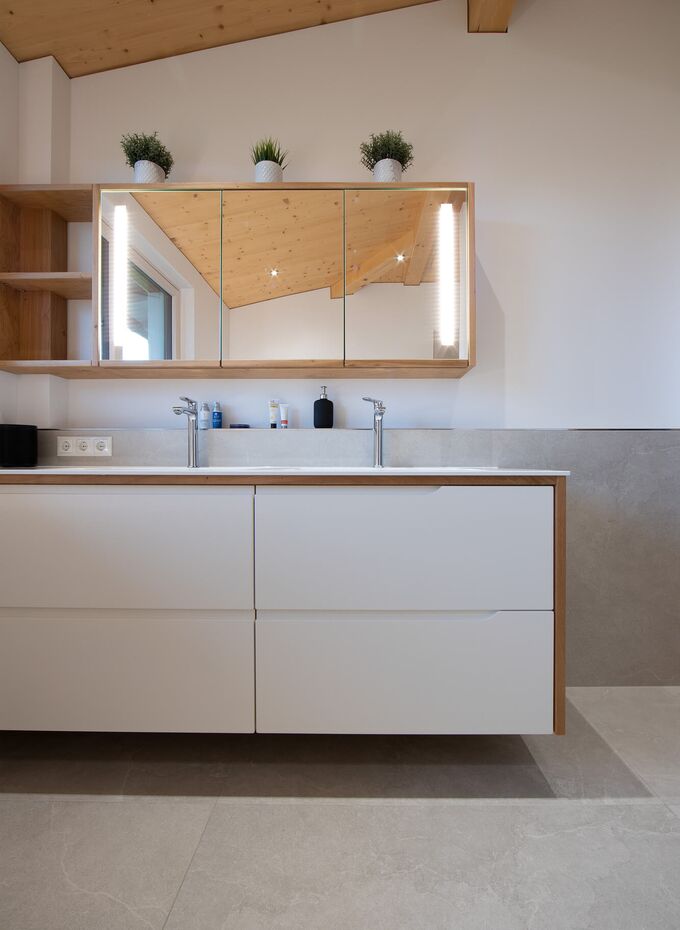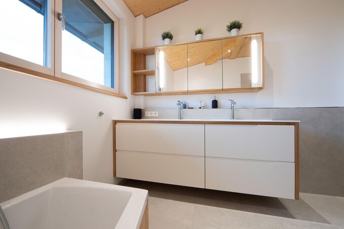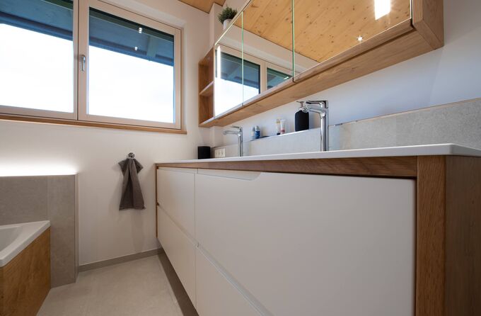Das astige Eichenholz wird auch in Bädern immer beliebter. Hier wurde Eichenholz naturlackiert und mit mattem Weiß kombiniert. Die Griffleisten sind direkt in die Badmöbel gefräst, um lästige Fingerabdrücke von Beginn an zu vermeiden und kalte Griffe gibt es dadurch auch keine. Nicht nur das Holz agiert hier als Weichzeichner, auch besondere Lichtquellen schaffen eine ganz eigene Stimmung. Holz macht Bäder einfach wohnlicher, sorgt für optische Wärme und eine gemütliche Atmosphäre.