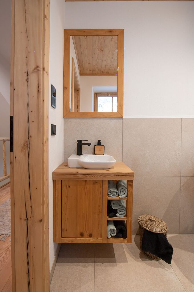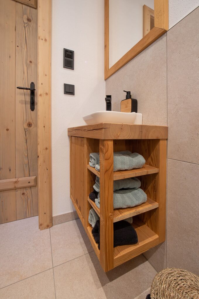 Badezimmer sind für viele von uns richtige Wohlfühloasen. Maß gefertigte Möbel aus Holz geben dem Raum Wärme und Struktur und bieten viel Stauraum. Diese Möbel wurden aus massiv gehackten, gebürsteten und geölten Fichtenholz hergestellt und mit einem klassisch, modernen Doppelwaschbecken kombiniert. Black is back: Armaturen in der neuen Trendfarbe Schwarz durften hier natürlich nicht fehlen und geben diesem Raum einen besonderen Charakter, wodurch das Moderne hier nicht zu kurz kommt.