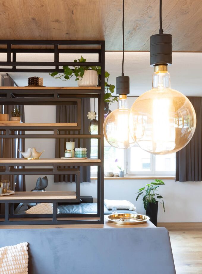 Ein besonderes Highlight ist das schwarze Metallregal, das als Raumtrenner dient. Es schafft nicht nur eine klare Abgrenzung zwischen den verschiedenen Wohnbereichen, sondern bietet auch zusätzlichen Stauraum und Platz für Dekorationen. Das Regal aus schwarzem Metall fügt sich nahtlos in das industrielle Design des Esstisches ein und rundet das Gesamtbild perfekt ab.