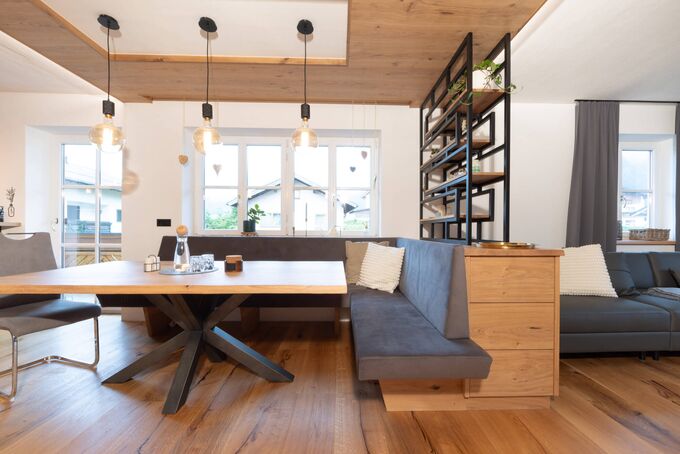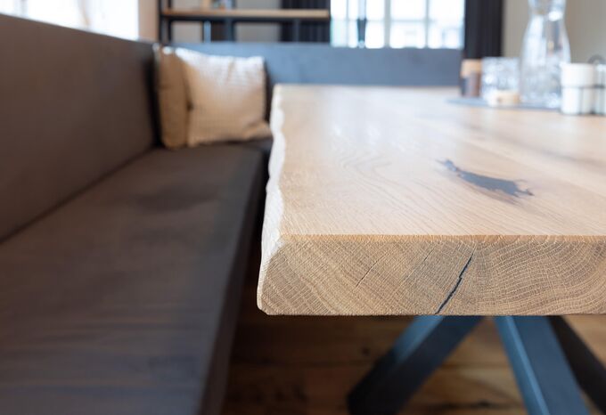 Essplatz mit massivem Eichen- Esstisch und grauer Eckbank