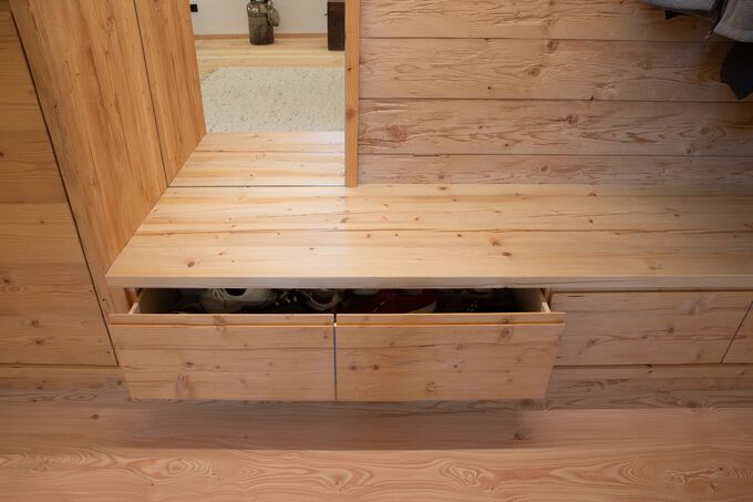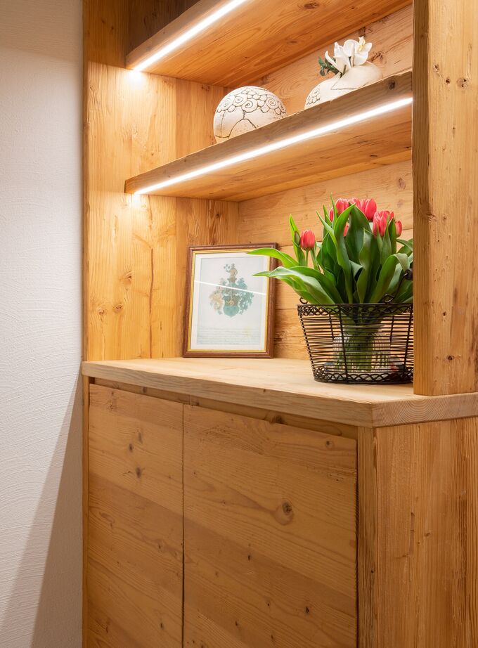 Diese Garderobe fügt sich in das Gesamtkonzept „Fichtenholz“ ein. Hier zählt nicht nur die Optik, eine Garderobe muss praktisch sein und viel Stauraum bieten. Breite Auszugsladen, Schränke, Regale, eine Sitzbank und ein Hängeelement wurden integriert. Das dunkle Metall/ Eisen ist eine stylische Kombination zum massiv gehackten Fichtenholz und die integrierte LED Beleuchtung setzt gezielte, dekorative Akzente.