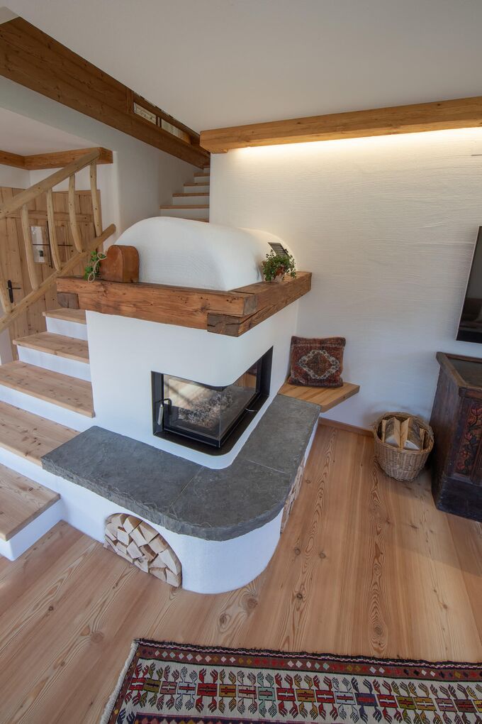 Dieser Kachelofen wurde perfekt in den gesamten Wohnbereich integriert. Das massiv gehackte, gebürstete und geölte Fichtenholz wurde auch hier für die Umrandung im oberen Bereich des Kamins gewählt. Dieser Ofen dient nicht nur als wohltuende Wärmequelle, sondern ist ein optisches Highlight in diesem Raum!