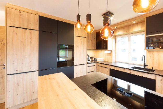 Diese stilvolle Küche kombiniert die warme, einladende Atmosphäre von Eichendekor mit der eleganten Schlichtheit schwarzer Fronten. Die Oberschränke sind mit schwarzen Glasfronten mit Metallrahmen versehen, die für einen modernen und zugleich industriellen Look sorgen.