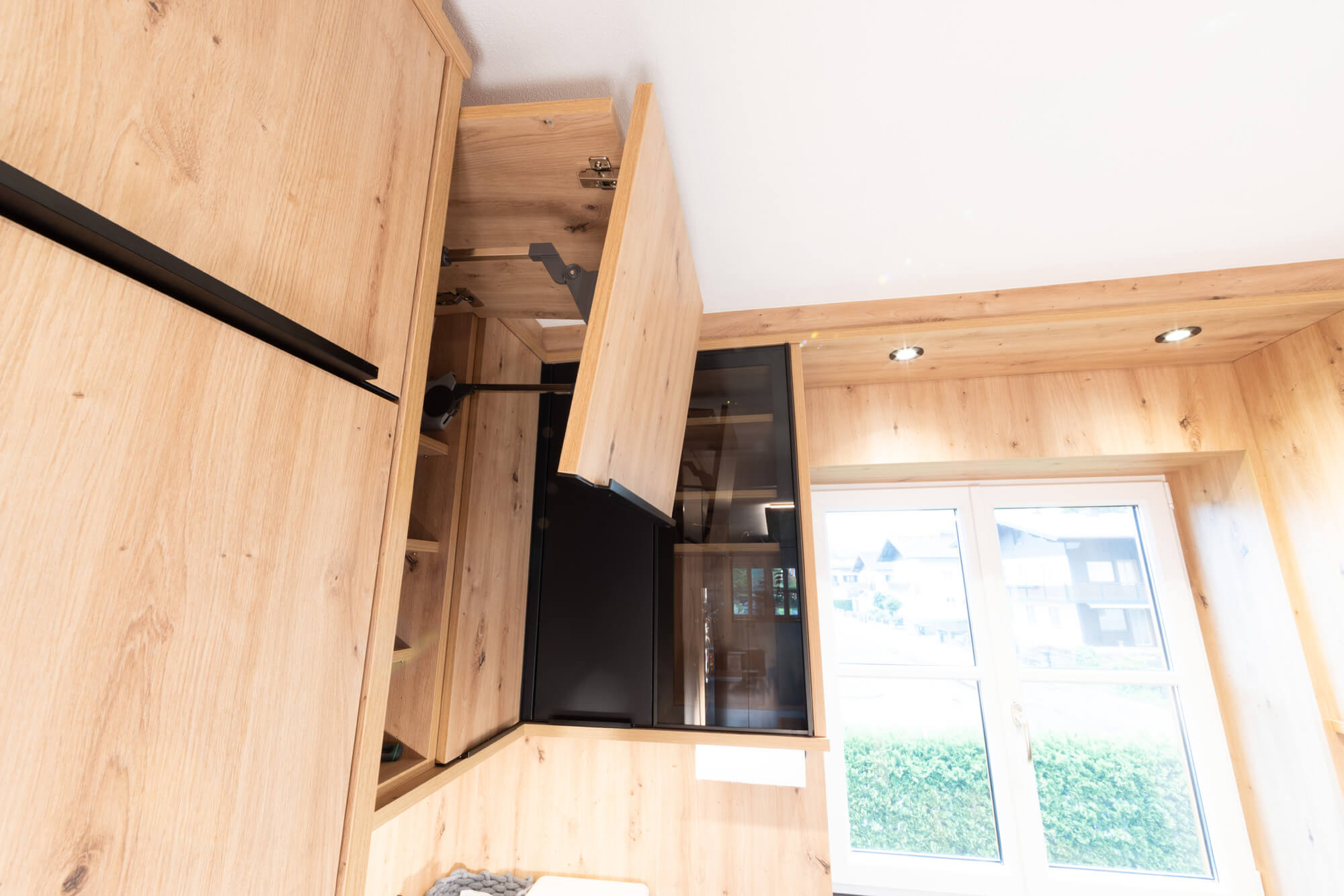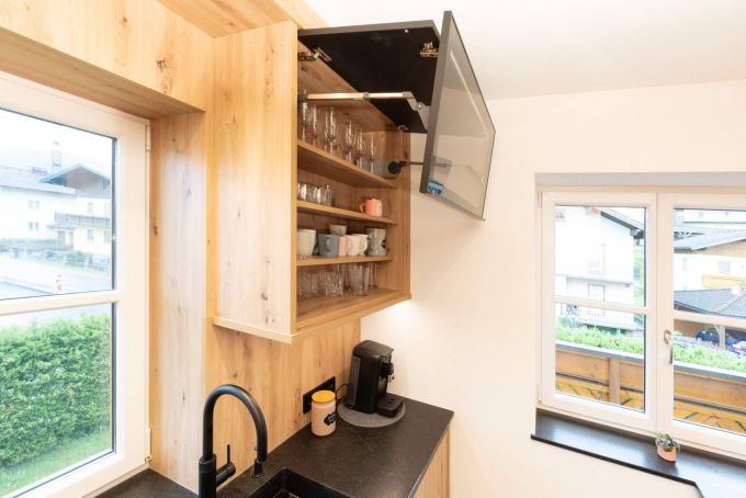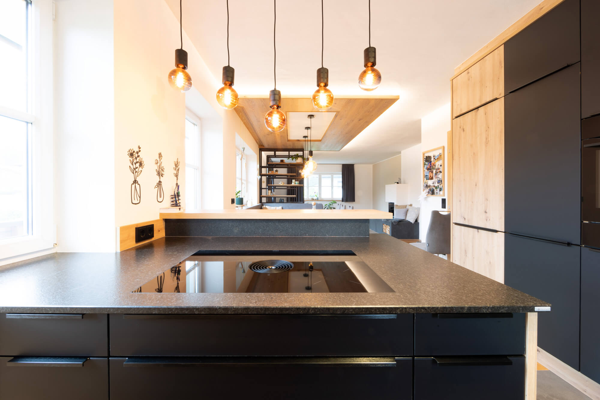Die Kücheninsel ist mit einem Ceranfeld ausgestattet und bietet zusätzlich einen Barbereich, der zum Verweilen und geselligen Beisammensein einlädt. Die gesamte Küche ist bis zur Decke verbaut und verblendet, was nicht nur eine nahtlose Optik, sondern auch maximalen Stauraum bietet.