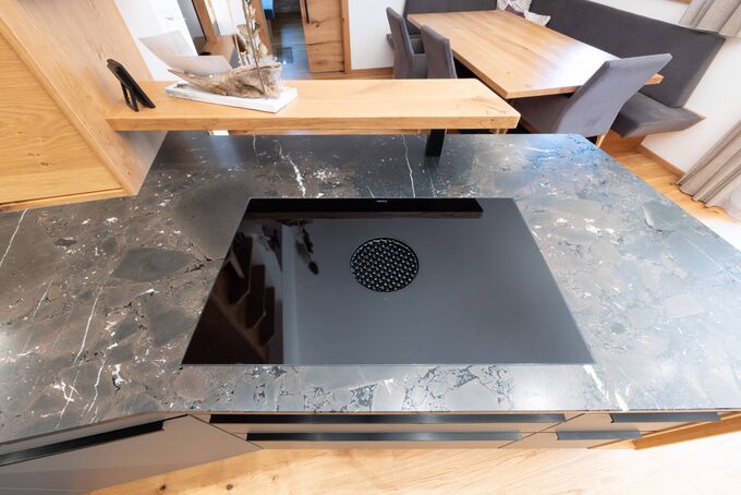 Ein besonderes Highlight ist die offene beleuchtete Nische, die als dekoratives Element dient. Diese durchdachte Kombination aus Materialien und Funktionen macht die Küche zu einem idealen Ort für kulinarische Kreationen und gesellige Momente.