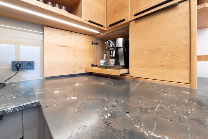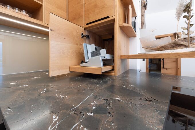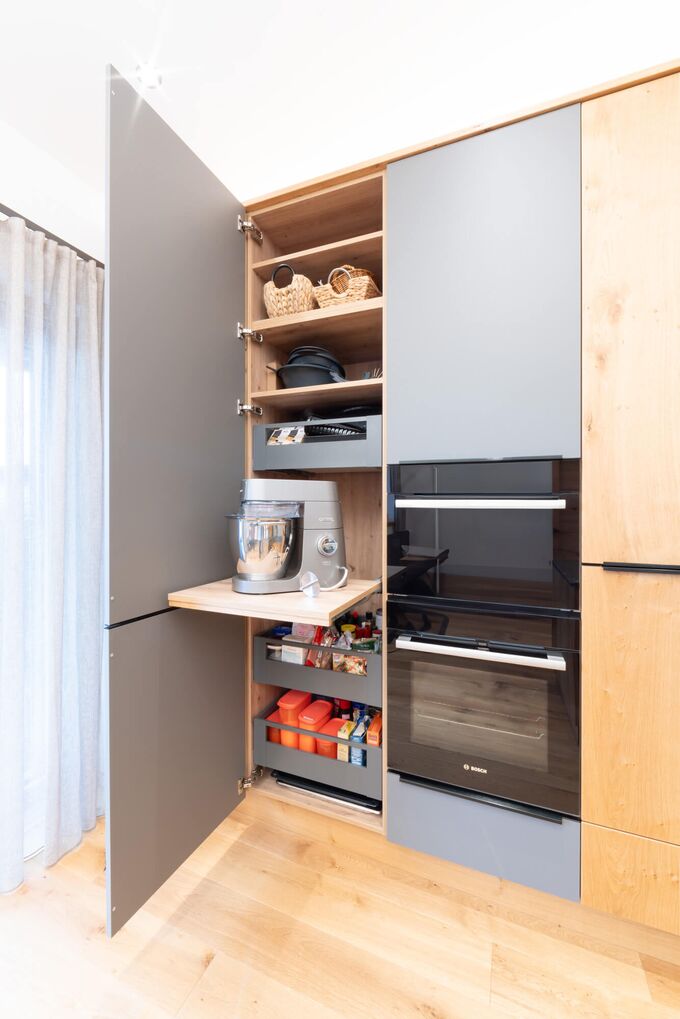 Praktische Auszüge für die Kaffeemaschine und Aufschnittmaschine sowie ein Stauraumschrank mit Tablarauszug für die Küchenmaschine sorgen für optimalen Komfort und Funktionalität. Die Kücheninsel mit integrierter Barplatte bietet einen perfekten Ort für gesellige Zusammenkünfte.