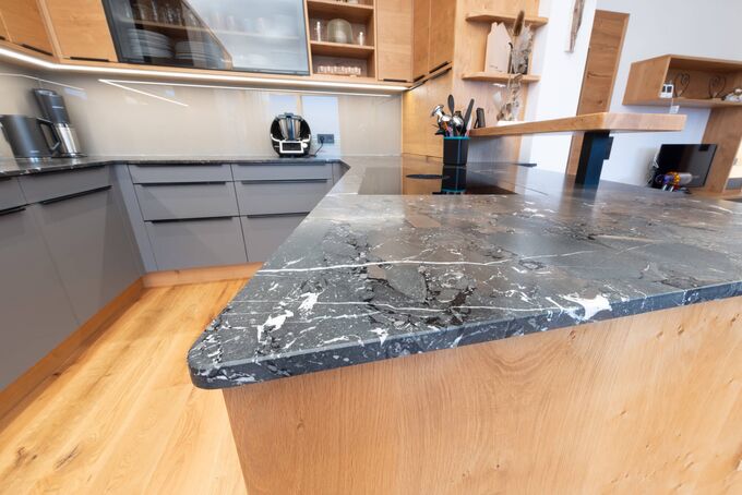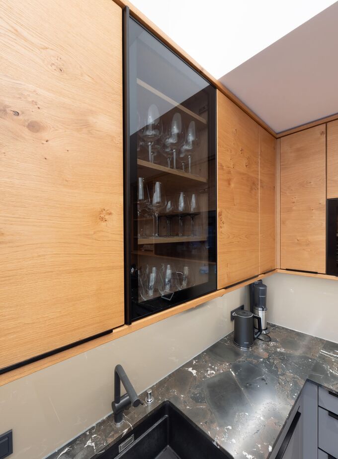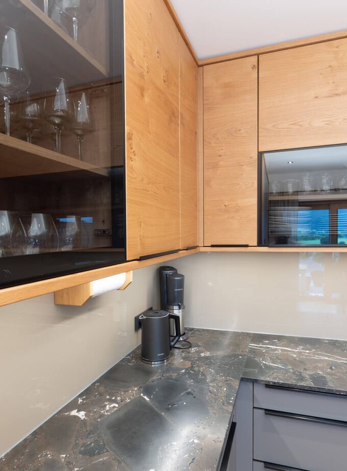 Diese Küche vereint modernes Design mit praktischen Funktionen. Die Fronten in Anthrazit matt und Wildeiche, kombiniert mit schwarzen Griffleisten, schaffen eine stilvolle und zeitgemäße Ästhetik. Die Arbeitsplatte aus Naturstein Infinity fügt einen Hauch von Luxus hinzu. Die Glasfronten mit schwarzen Metallrahmen verleihen der Küche einen modernen und eleganten Look.