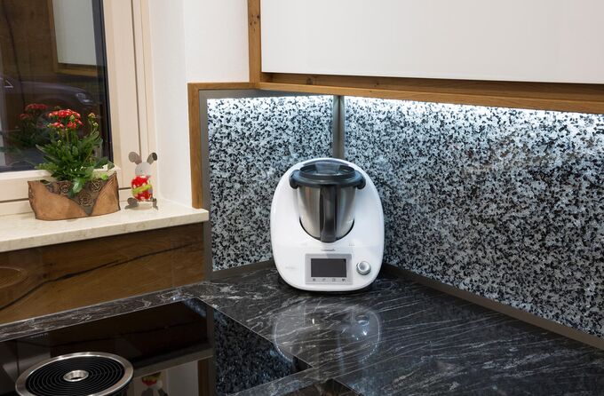 Ein besonderer Hingucker bei dieser Küche ist auch die Küchenrückwand die aus Kristallglasbruch besteht und mit der Beleuchtung sehr schön funkelt. Diese art der Glasrückwand gibt es in vielen Farben und mit verschiedenen Effekten. Auch Schriften oder Muster sind möglich.