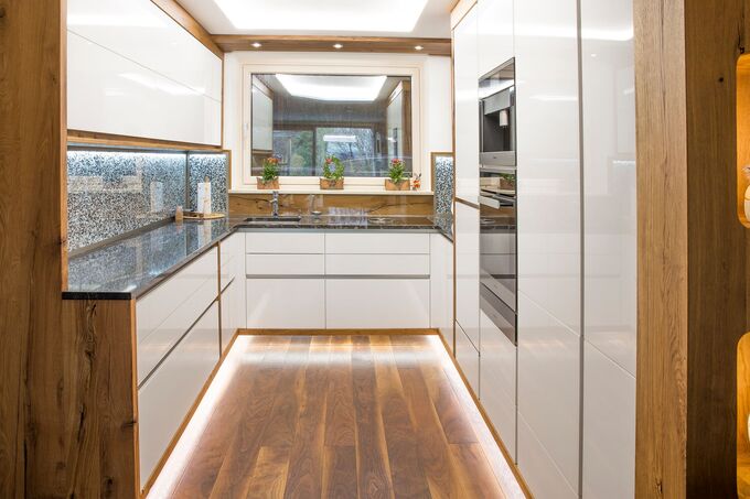 Der massive Abschluss Block samt Nischeneinfräsung und Beleuchtung und der verspiegelte Sockel der die Küche förmlich schweben lässt sind noch zwei Kundenwünsche die wir natürlich gerne erfüllten.