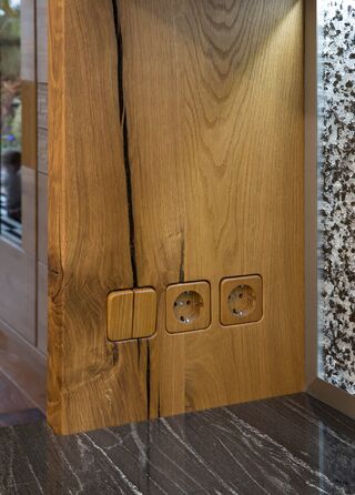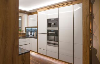 Diese besondere Küche bietet nicht nur allerleih Annehmlichkeiten wie Einbaukaffeemaschine, und weitere top Geräte von MIELE, durch die Verwendung von Hochglanzfronten mit Glaseffekt und der dunklen Schlosseiche entsteht eine ganz besondere Küche die sich sehen lassen kann. Die Schlosseiche ist Holz das bereits mehrere Hundert Jahre in Schlössern oder alten Adeligen Gehöften eingebaut war. Dieses Holz wird im Zuge von Umbau oder Renovierungsarbeiten ausgebaut aufbereitet und kann so mit seinem ganz besonderem Charme wieder verwendet werden.