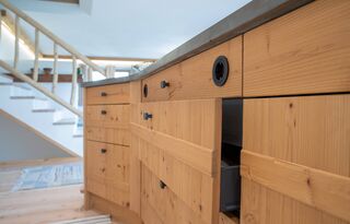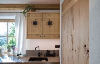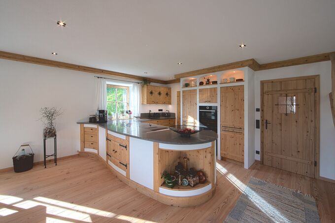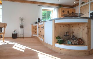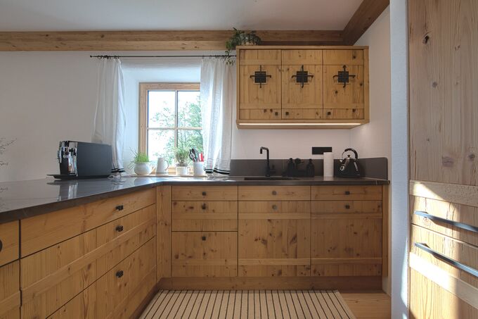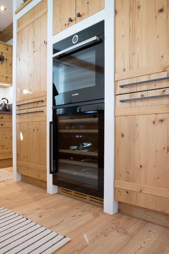 Diese Küche ist ein wahres Schmuckstück. Hier wurde mit massiv gehacktem, gebürstetem und geöltem Fichtenholz gearbeitet.