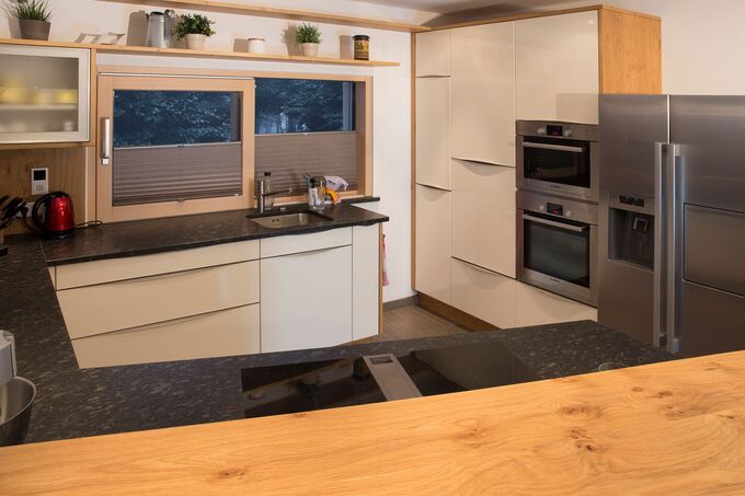Die Kombination aus Eiche astig und Fronten in Hochglanz weiß steht für eine gemütliche Atmosphäre und zeitlose Eleganz. Die modernen Griffleisten in Edelstahl und die Natursteinplatte mit Ledereffekt-Oberfläche sorgen für den besonderen Look dieser Wohnküche. Auch die praktische Komponente nimmt bei einer maßgeschneiderten Küche einen hohen Stellenwert ein: So wurde der Geschirrspüler erhöht positioniert, Bora Classic Kochfelder mit integriertem Dunstabzug und eine Bar mit schräger Rückwand und Freiregalen eingebaut.