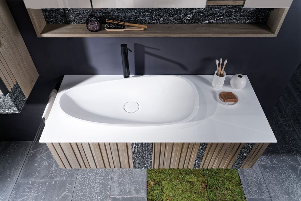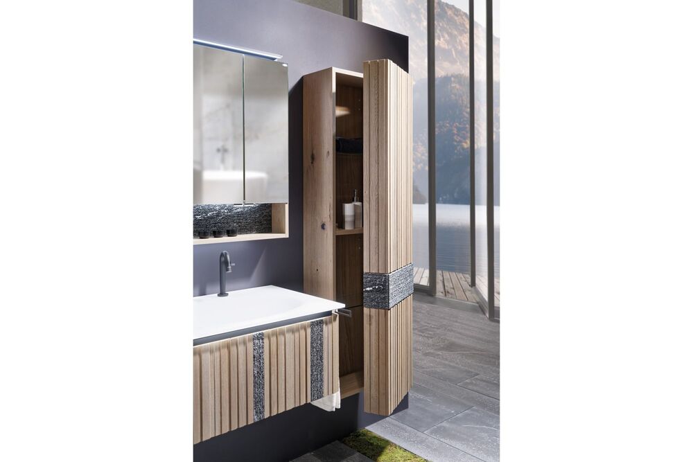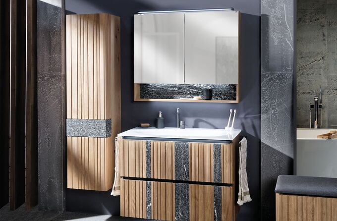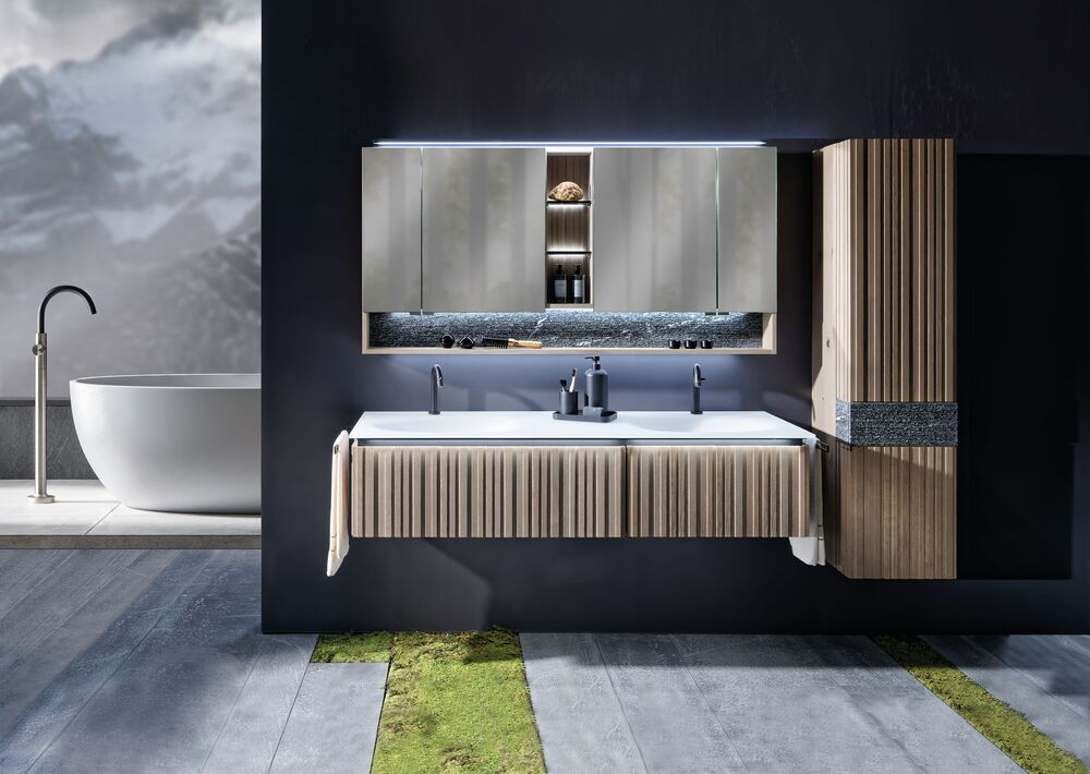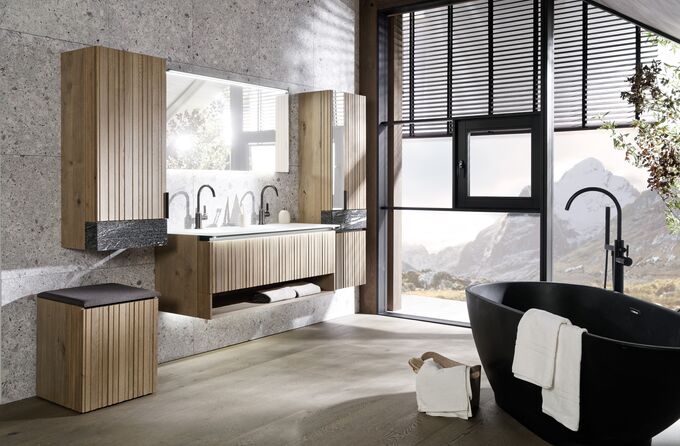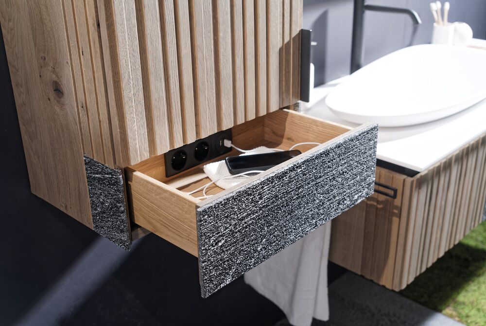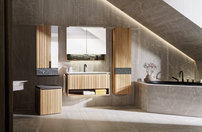 Vlineos fasziniert durch seine vertikale Massivholzstruktur, inspiriert von traditionellen Almstadl’n-Fassaden. In Kombination mit dem rauen, archaisch wirkenden Alpengranit entsteht ein unverwechselbarer Look. Die Becken erinnern in ihrer Form an geschliffene Flusssteine und runden das Design harmonisch ab.