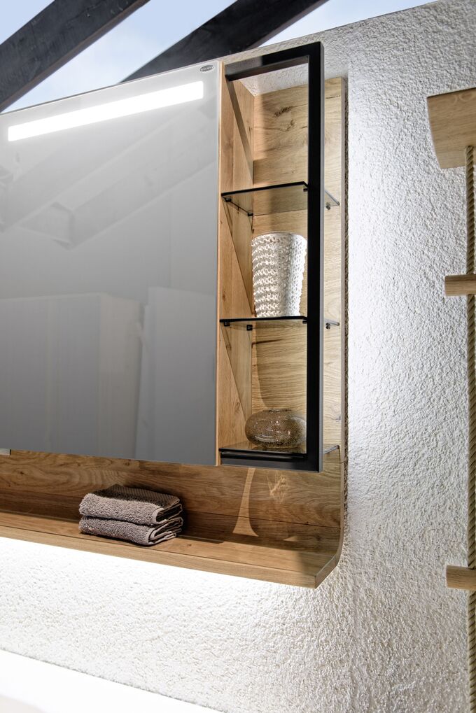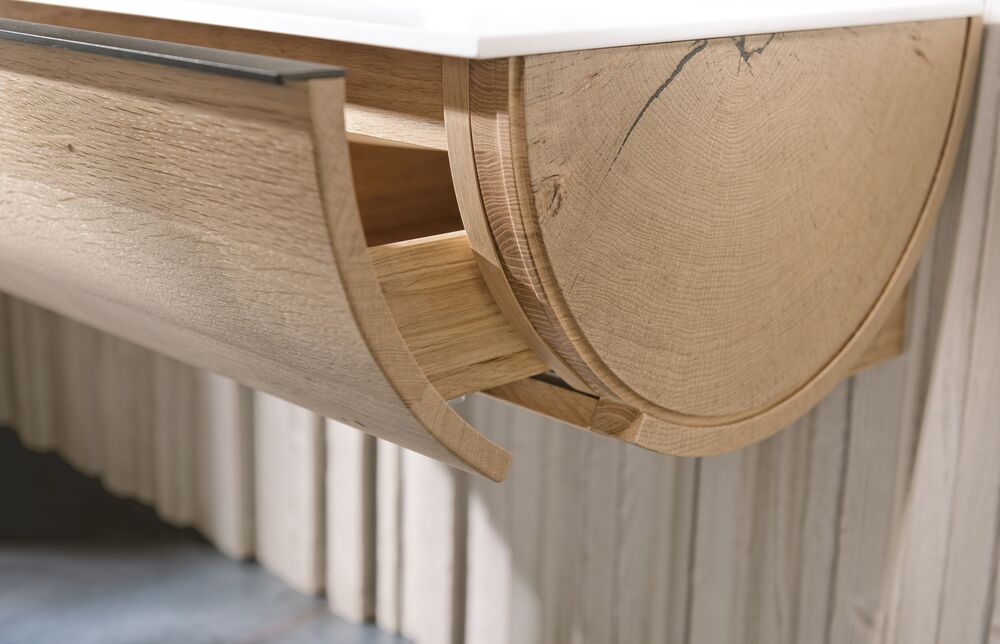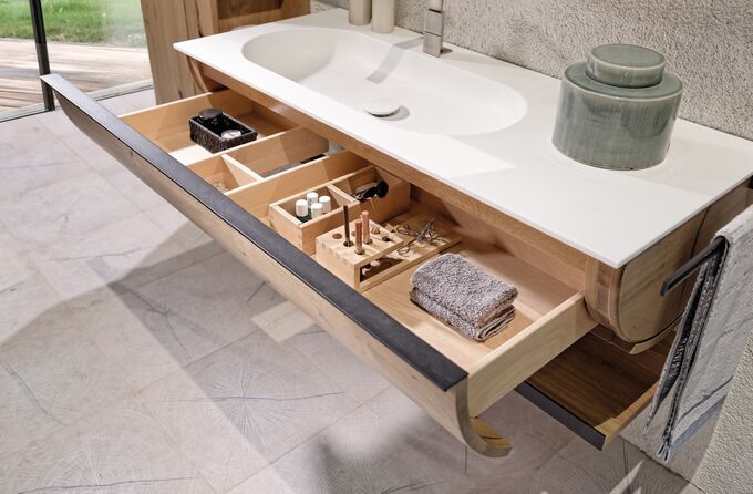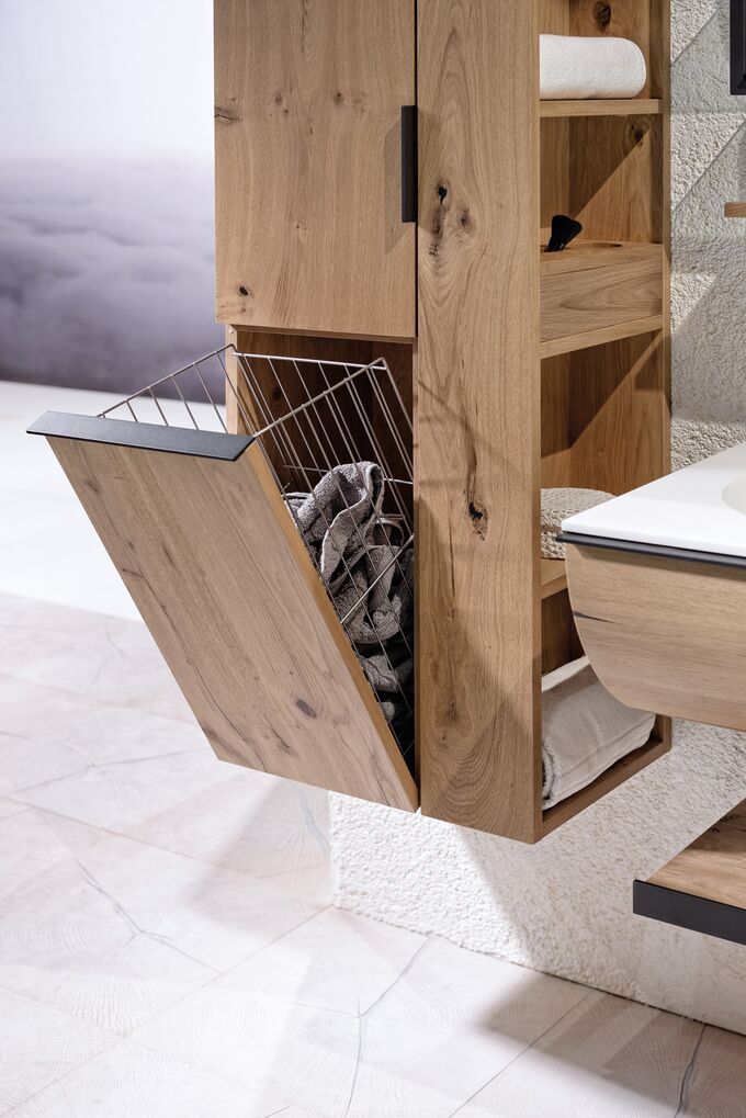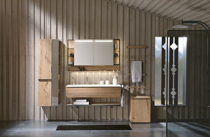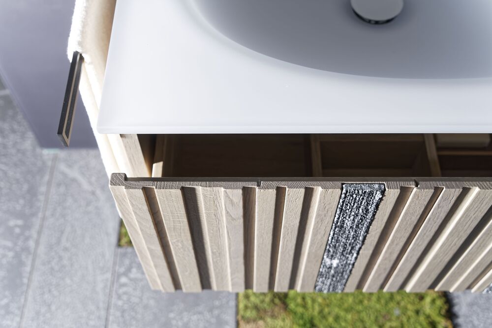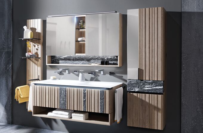 Vlineos fasziniert durch seine vertikale Massivholzstruktur, inspiriert von traditionellen Almstadl’n-Fassaden. In Kombination mit dem rauen, archaisch wirkenden Alpengranit entsteht ein unverwechselbarer Look. Die Becken erinnern in ihrer Form an geschliffene Flusssteine und runden das Design harmonisch ab.