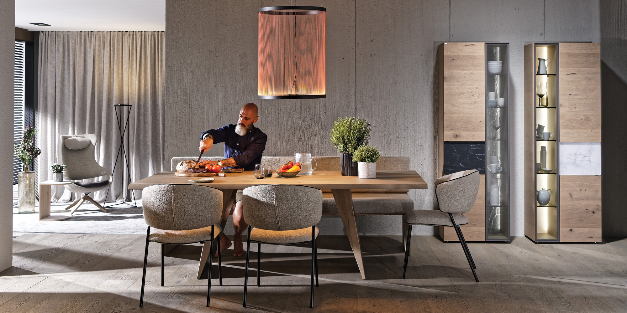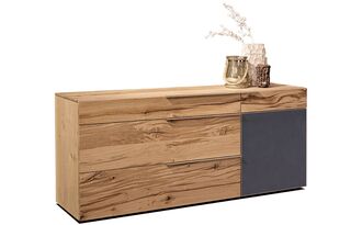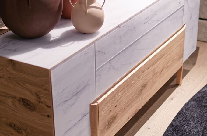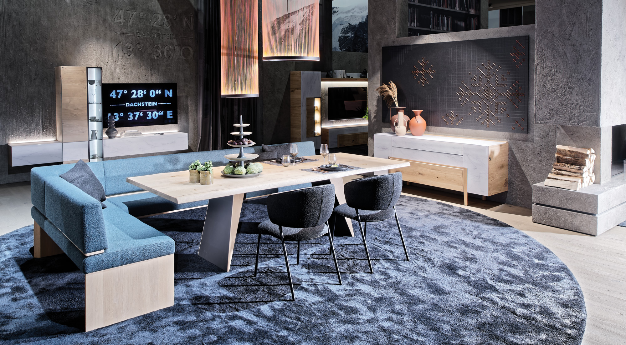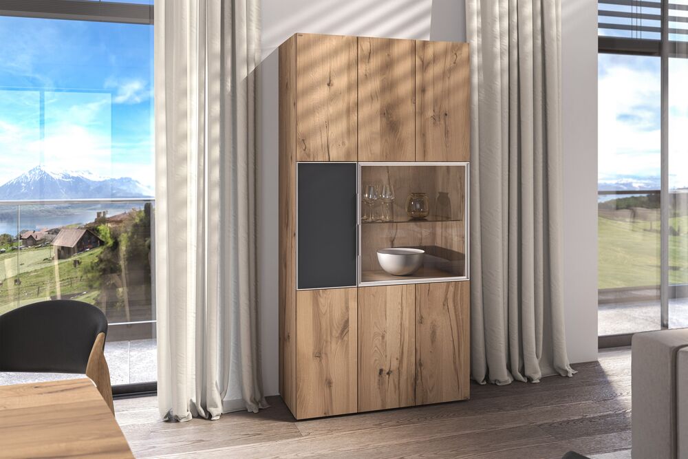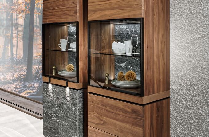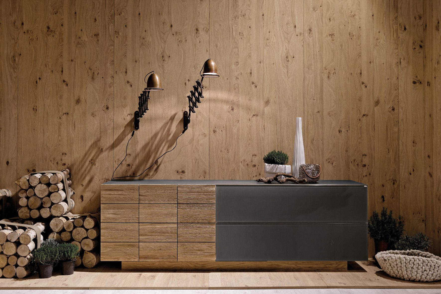 Vrock verbindet die kraftvolle Bergwelt mit zeitloser, klarer Formgebung. Die Kombination aus gebürsteter Alteiche rustiko und dem markanten schwarzgrauen Alpengranit verleiht dem Wohnraum ein authentisches alpines Flair. Großzügige, schwebend wirkende Abdeckplatten bei Side- und Lowboards setzen stilvolle Akzente. Die feine Holzstruktur, das detailreich gearbeitete Steinrelief und das gebürstete Schwarzmetall unterstreichen die handwerkliche Präzision von Vrock.