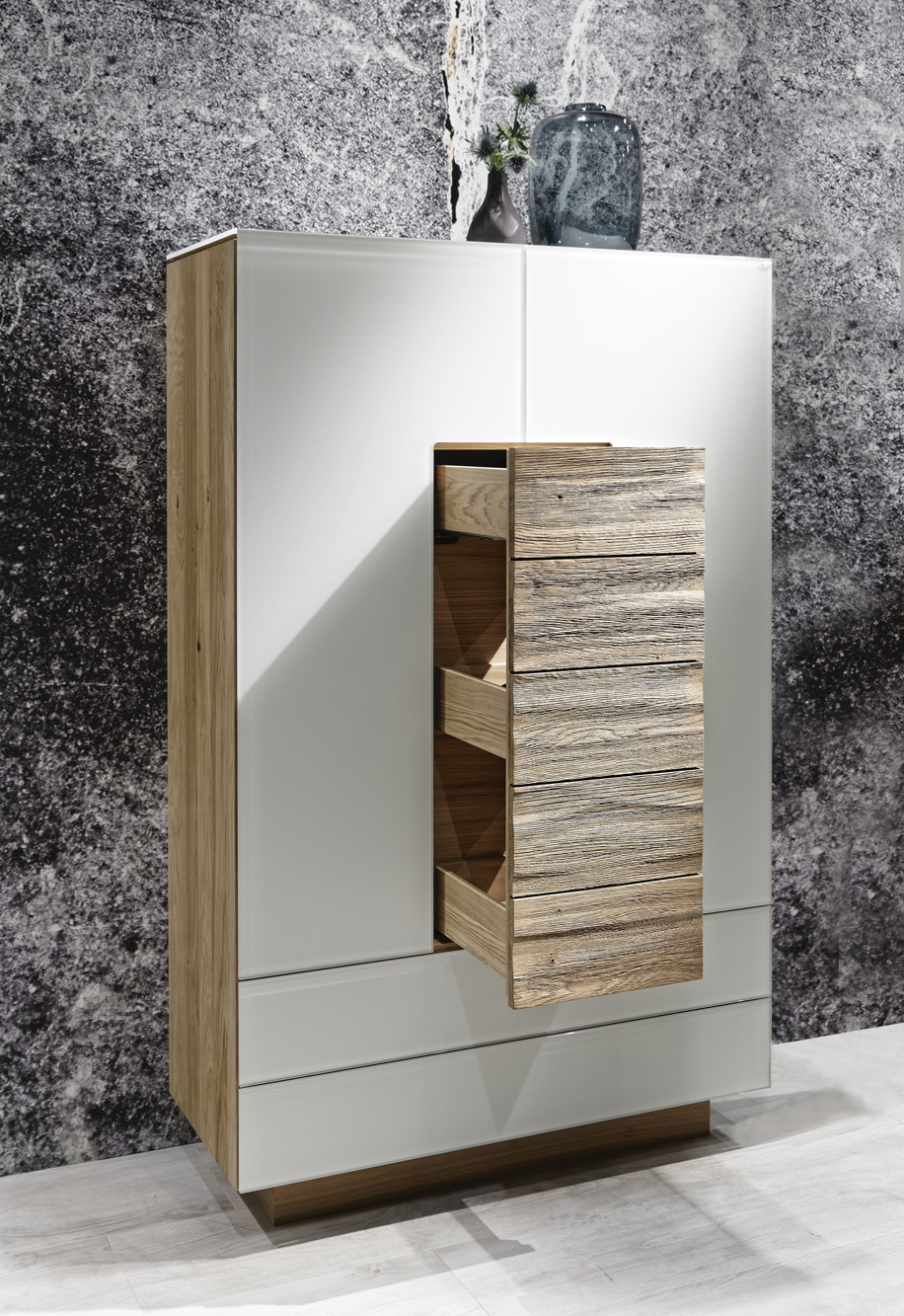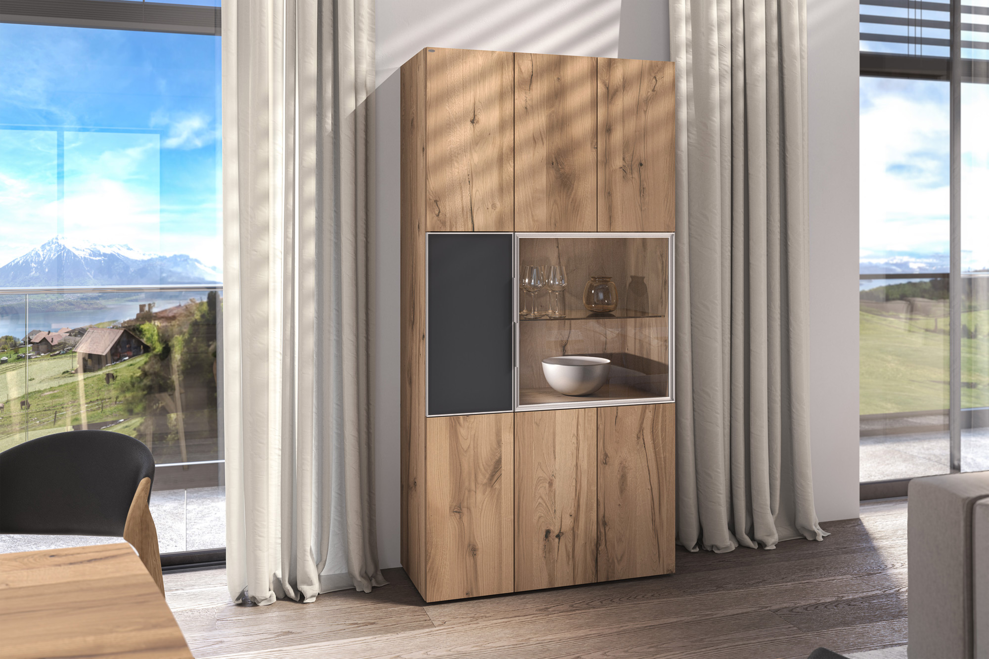Vmontanara erfüllt den Wunsch nach natürlicher Ursprünglichkeit und moderner Wohnkultur. Das einzigartige Spaltholzdesign in Kombination mit natürlichem Satinato Glas schafft eine harmonische Balance und spiegelt den aktuellen Zeitgeist wider.