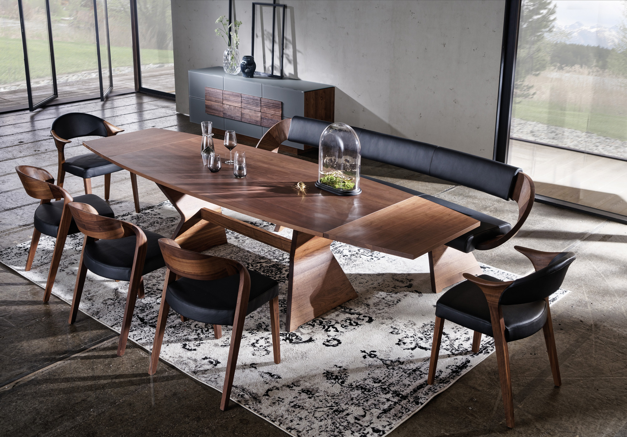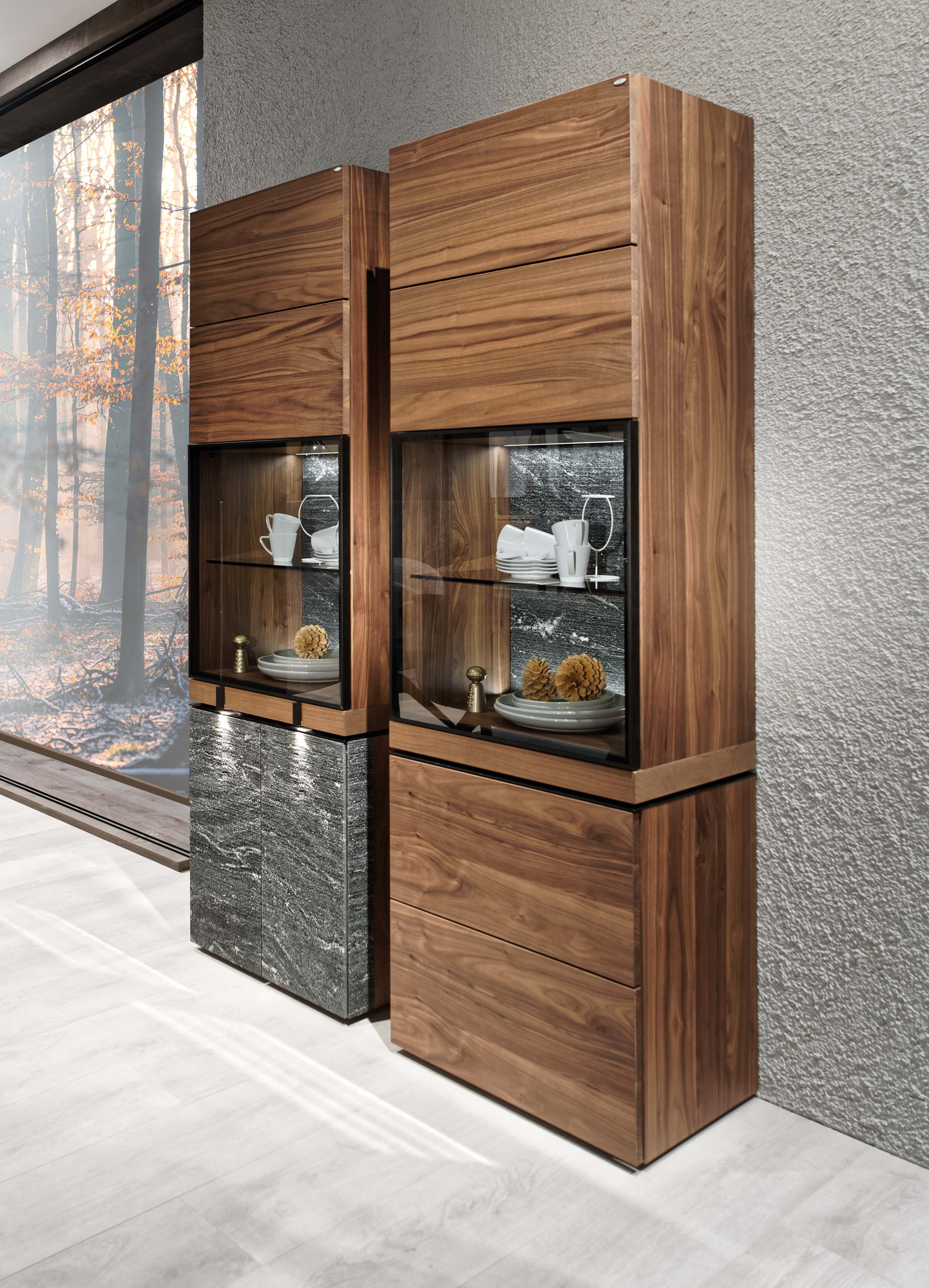 Die Kollektion Vtektura verkörpert eine tiefe Verbindung zur alpinen Identität. Die Korpusmöbel setzen auf pigmentiertes Glas, das mit seiner Struktur an imposante Gletscherlandschaften erinnert.