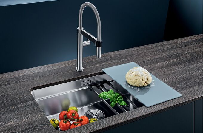 Dieses neue Funktionsstufen-Konzept von BLANCO macht ein Becken zur vollwertigen Spüle. Durch die integrierte Stufe lässt sich das Becken auf 3 Ebenen parallel nutzen.