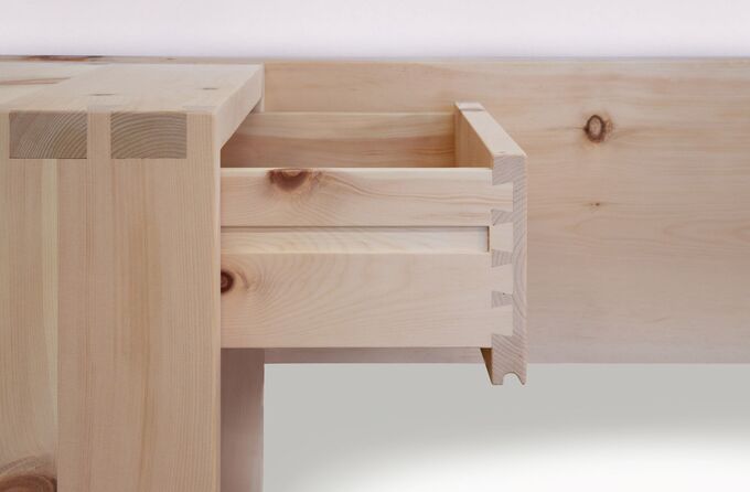 Bei unserem Zirbenbett LIBERA greifen wir auf traditionelles Handwerk zurück, und bauen Betten wie früher. Statt Leim- und Metallschrauben kommen wieder ökologische und traditionelle Holzverbindungen zum Einsatz (z.B. Schwalbenschwanz-Verbindungen, Gratleisten-Verbindungen oder Holznägel-Verbindungen). Keine Schrauben, keine Beschläge: Ihr Zirbenbett LIBERA ist dank Holzverbindungen in kürzester Zeit aufgebaut.