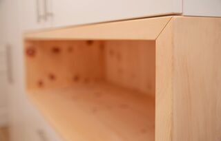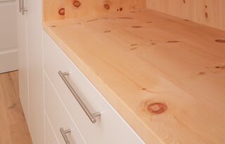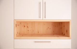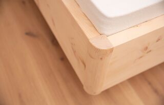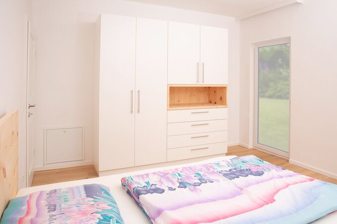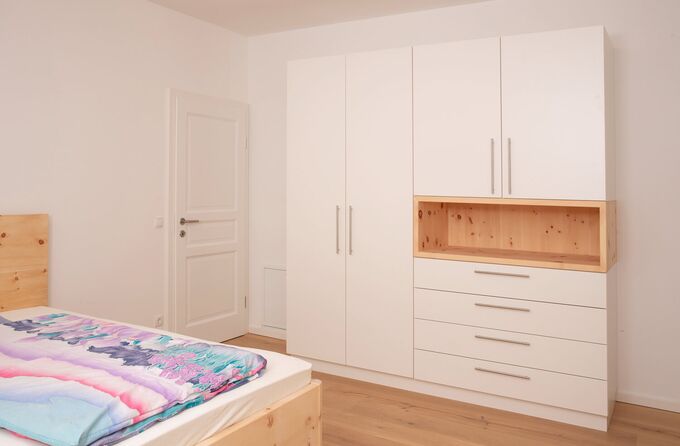 Ausgeruht aufwachen in einem Zirbenschlafzimmer mit hellen Farben. Zirbenholz kann mit vielen Materialien kombiniert werden um auch den modernen Wohntraum zu erfüllen. Hier haben wir Dekorspanplatte mit mattem weiß zusammen gebracht. Reling Griffe aus Edelstahl komplettieren den Schrank. Bei diesem Zirbenbett wurden die Ecken an den Fußenden abgerundet. Im Schrank sind Schubladen, Kleiderstange und eine offene Nische aus Zirbenholz verbaut. Natürlich wurde beim Zirbenholz auf schöne Holzmasserung und Herkunft geachtet. Wir fertigen alles bei uns in Kuchl, südlich von Salzburg.