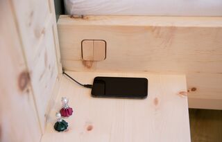 Ein kleiner Durchlass für das Ladekabel sorgt für eine Ladezone auf dem Nachtkästchen und der Kabelsalat bleibt außer Sicht.