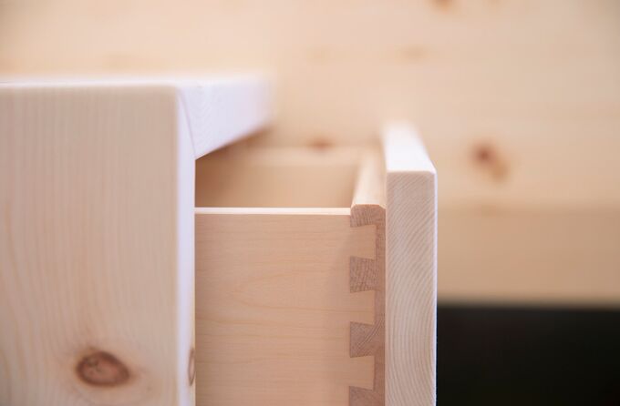 Natürlich sind auch die Schubladen in Zirbe massiv mit Schwalbenschwanzzinkenverbindung gefertigt. Dazu der raumhohe Schrank, der passgenau in die Schlafzimmerwand eingebaut wurde und so den größtmöglichen Stauraum mit drei großen Schubladen und 6 hohen Drehtüren bietet. Im Schrank befinden sich ein Kleiderlift, verstellbare Fächer und Kleiderstangen, genau nach Kundenwunsch.